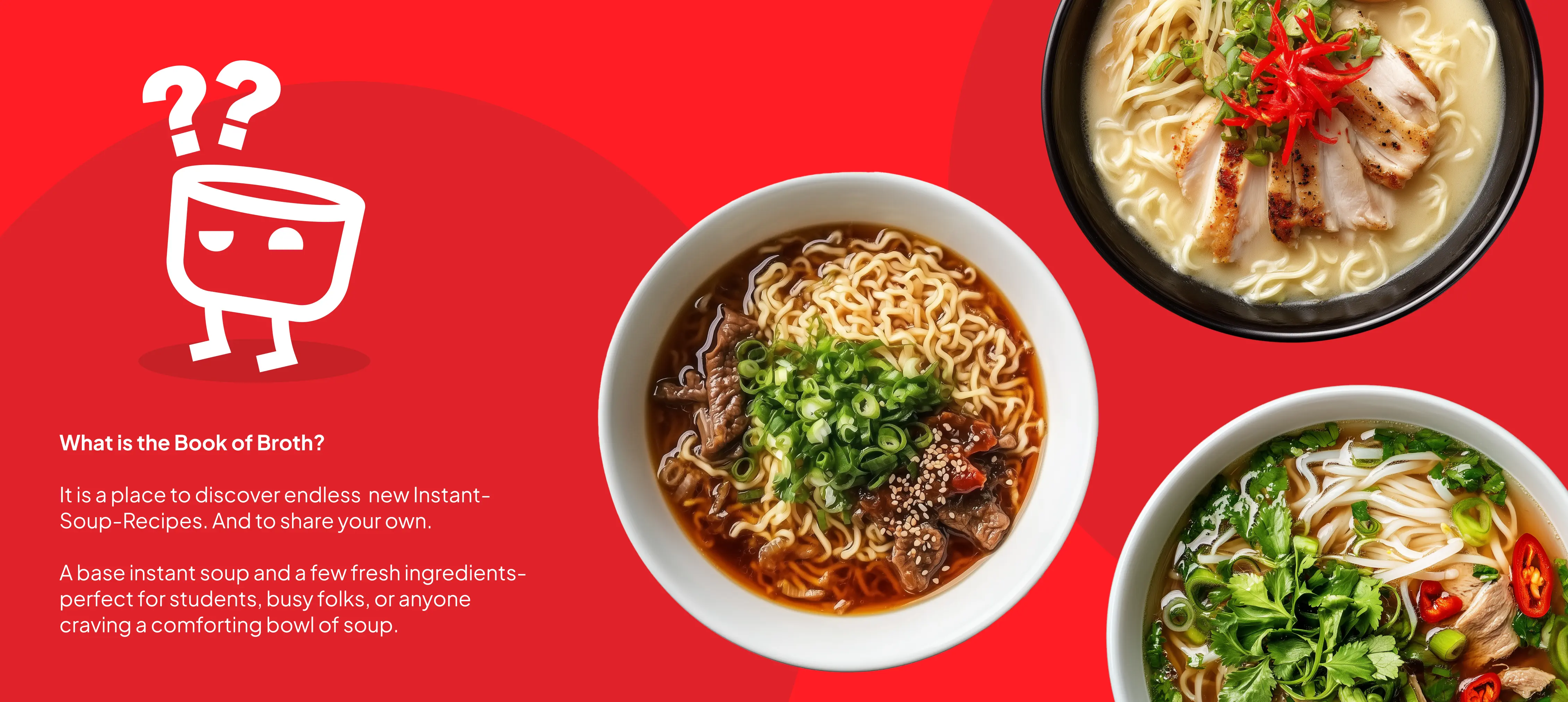 The Book of Broth ist eine UX/UI-Case Study über eine Plattform zum Entdecken und Teilen kreativer Instant-Suppen-Rezepte – schnell, simpel und alltagstauglich.
